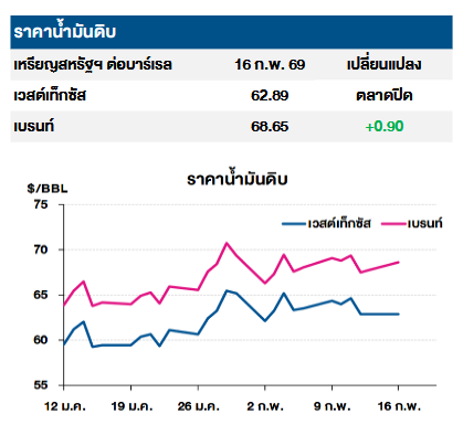 โดยราคาน้ำมันดิบเวสต์เทกซัสซื้อขายเมื่อ 16 ก.พ. 2569 อยู่ที่ 62.89 เหรียญสหรัฐต่อบาร์เรล (ตลาดปิด) และราคาน้ำมันดิบเบรนต์อยู่ที่ 68.65 เหรียญสหรัฐต่อบาร์เรล เพิ่มขึ้น +0.90 เหรียญสหรัฐต่อบาร์เรล