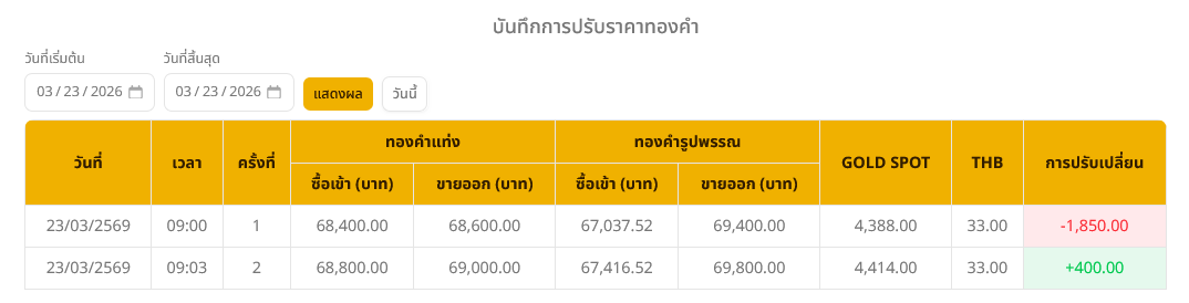 ราคาทองวันนี้ (23 มี.ค. 2569) ร่วงลง 1,450 บาท เมื่อเปรียบเทียบกับราคาปิดวานนี้ โดยราคาทองรูปพรรณขยับมาอยู่ที่บาทละ 69,800 บาท ตามข้อมูลล่าสุด จากเว็บไซต์ของสมาคมค้าทองคำ เมื่อเวลา 09.03 น. ที่ผ่านมา