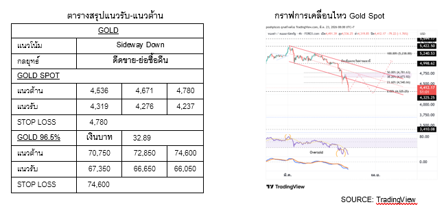 แต่ตราบใดที่ยังระยะกลางราคายังไม่ผ่าน $4,998 ยังมองว่าอาจเป็น “ดีดเพื่อลง” เปิดสถานะขาย หากราคาดีดไม่ผ่าน $4,536 หากผ่าน $4,536 ชะลอไปขายบริเวณ $4,671-4,780 (ตัดขาดทุนหากราคาดีดผ่าน $4,780) ซื้อคืนสถานะขาย หากราคาไม่หลุด $4,319-4,276 (ตัดขาดทุนหากราคาดีดผ่าน $4,780)