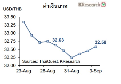 สำหรับสัปดาห์ถัดไป (6-10 ก.ย.) ธนาคารกสิกรไทยมองกรอบการเคลื่อนไหวของเงินบาทที่ 32.20-33.00 บาทต่อดอลลาร์ฯ ขณะที่ศูนย์วิจัยกสิกรไทยประเมินปัจจัยสำคัญที่ต้องติดตาม ได้แก่ กระแสเงินลงทุนของนักลงทุนต่างชาติ สถานการณ์โควิดและตัวเลขเงินเฟ้อเดือนส.ค. ของไทย รวมถึงผลการประชุมนโยบายการเงินของธนาคารกลางยุโรป (ECB)