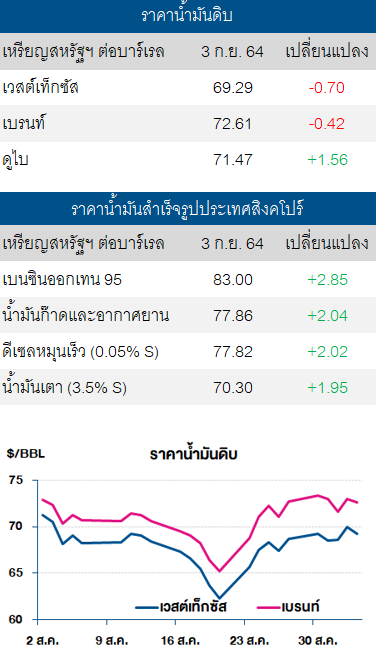 ปัจจัยลบ ราคาน้ำมันดิบเวสต์เท็กซัสและเบรนท์ปรับลด หลังตัวเลขการจ้างงานนอกภาคการเกษตร (Nonfarms Payrolls) ของสหรัฐในเดือน ส.ค. 64 ปรับตัวเพิ่มขึ้นเพียง 235,000 ตำแหน่ง ซึ่งต่ำกว่าที่นักวิเคราะห์คาดการณ์ว่าจะปรับเพิ่มขึ้น 728,000 ตำแหน่ง และต่ำกว่าในเดือนก่อนหน้าที่เพิ่มขึ้น 1,053,000 ตำแหน่ง ซึ่งตัวเลขการจ้างงานที่ต่ำกว่าคาดเป็นผลมาจากการแพร่ระบาดของไวรัสโควิด-19 สายพันธุ์เดลตาที่ยังส่งผลกระทบต่อการฟื้นตัวของเศรษฐกิจ