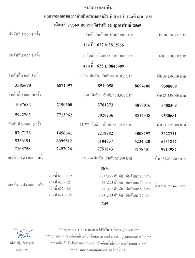 ตรวจผลการออกรางวัลเลขสลากจ่ายคืนสลากออมสินพิเศษ 1 ปี ออกรางวัลวันที่ 16 กุมภาพันธ์ 2569