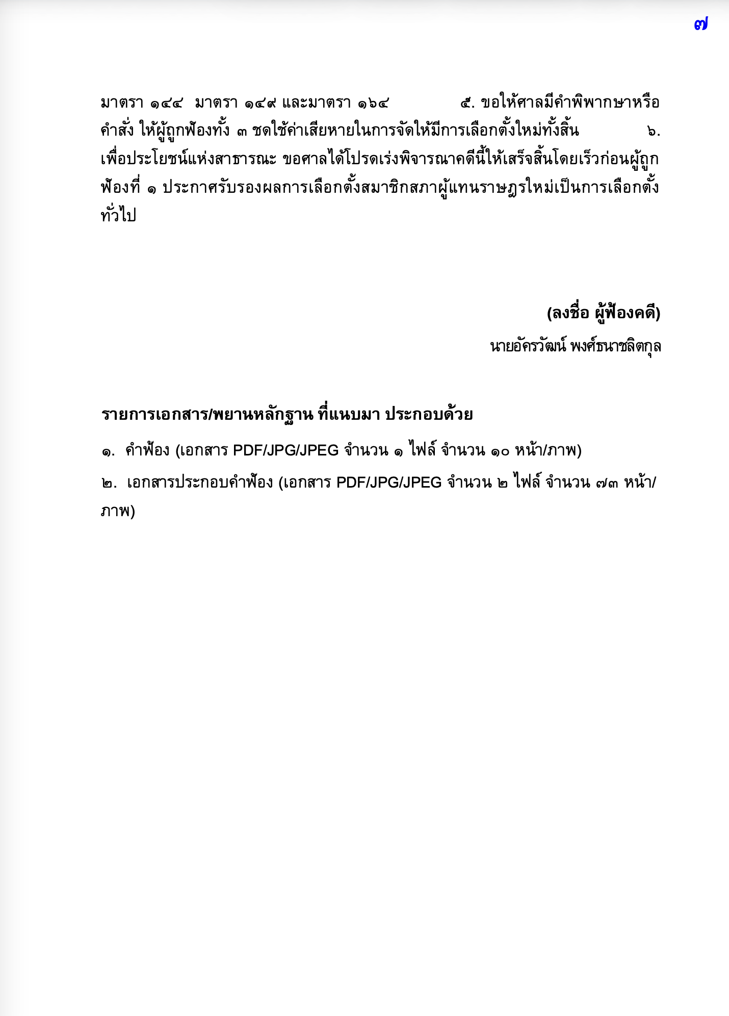 ในตอนท้ายของคำฟ้อง นายอัครวัฒน์ได้ขอให้ศาลมีคำพิพากษาหรือคำสั่ง ดังต่อไปนี้