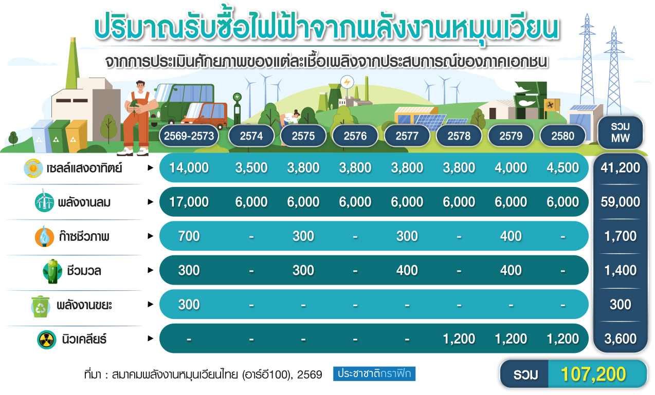 ทางกลุ่ม RE100 ได้จัดทำข้อเสนอปริมาณรับซื้อไฟฟ้าจากพลังงานหมุนเวียน ที่ควรเริ่มตั้งแต่ปี 2569 จนถึงปี 2580 จาก 6 ประเภท รวม 107,200 เมกะวัตต์ ซึ่งมาจากพลังงานเซลล์แสงอาทิตย์ (Solar) 41,200 เมกะวัตต์, พลังงานลม (Wind) 59,000 เมกะวัตต์, ก๊าซชีวภาพ (Biogas) 1,700 เมกะวัตต์, ชีวมวล (Biomass) 1,400 เมกะวัตต์, พลังงานขยะ (Waste2Energy) 300 เมกะวัตต์, นิวเคลียร์ (Nuclear) 3,600 เมกะวัตต์ เพราะเป็นพลังงานสะอาดที่จะให้ทำประเทศไทยไปสู่การปล่อยก๊าซเรือนกระจกสุทธิเป็นศูนย์ (Net Zero)