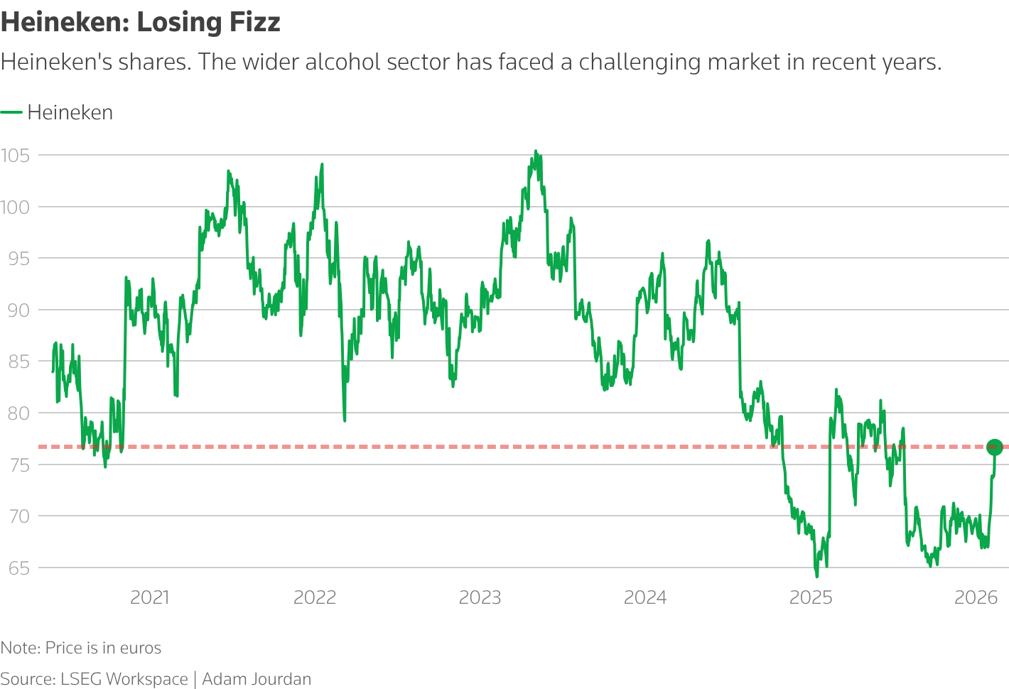 ไฮเนเก้น คาดการณ์ว่ากำไรในปี 2569 จะเติบโตช้าลง โดยอยู่ที่ระหว่าง 2% ถึง 6% เมื่อเทียบกับเป้าหมายเดิมในปี 2568 ที่เคยตั้งไว้ 4% ถึง 8%