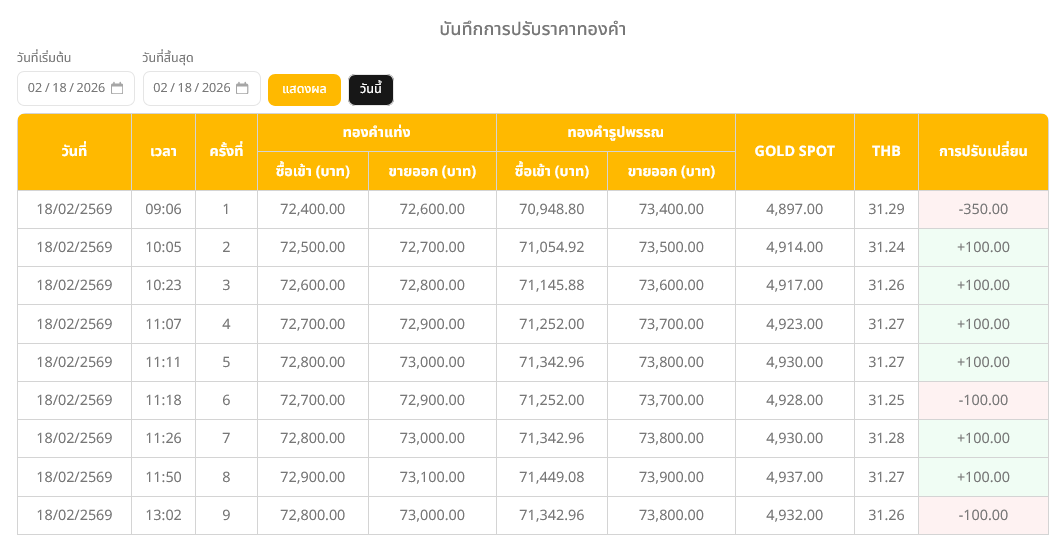 อ่านข่าวต้นฉบับ: ราคาทองวันนี้ (18 ก.พ. 69) ปรับขึ้น 50 บาท รูปพรรณบาทละ 73,800 บาท