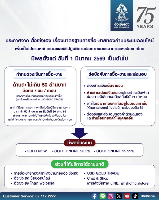 ผู้สื่อข่าวรายงานว่า ฮั่วเซ่งเฮง ผู้ค้าทองคำรายใหญ่ ได้ออกประกาศ เรื่อง มาตรฐานการซื้อ-ขายทองคำบนระบบออนไลน์ เพื่อเป็นไปตามหลักเกณฑ์และวิธีปฏิบัติตามประกาศของธนาคารแห่งประเทศไทย มีผลตั้งแต่วันที่ 1 มีนาคม 2569 เป็นต้นไป