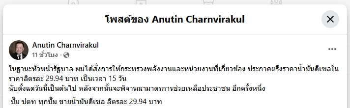 ด้านความเคลื่อนไหวของรัฐบาลในการรับมือสถานการณ์พลังงาน เมื่อคืนนี้ (3 มี.ค. 2569) นายอนุทิน ชาญวีรกูล นายกรัฐมนตรี โพสต์ผ่านเฟซบุ๊ก ระบุว่า “ในฐานะหัวหน้ารัฐบาล ผมได้สั่งการให้กระทรวงพลังงานและหน่วยงานที่เกี่ยวข้อง ประกาศตรึงราคาน้ำมันดีเซลในราคาลิตรละ 29.94 บาท เป็นเวลา 15 วัน นับตั้งแต่วันนี้เป็นต้นไป หลังจากนั้นจะพิจารณามาตรการช่วยเหลือประชาชน อีกครั้งหนึ่ง”