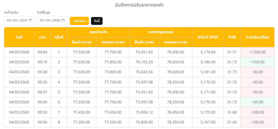 อ่านข่าวต้นฉบับ: ราคาทองวันนี้ (4 มี.ค. 69) ปรับลง 1,800 บาท รูปพรรณบาทละ 78,250 บาท