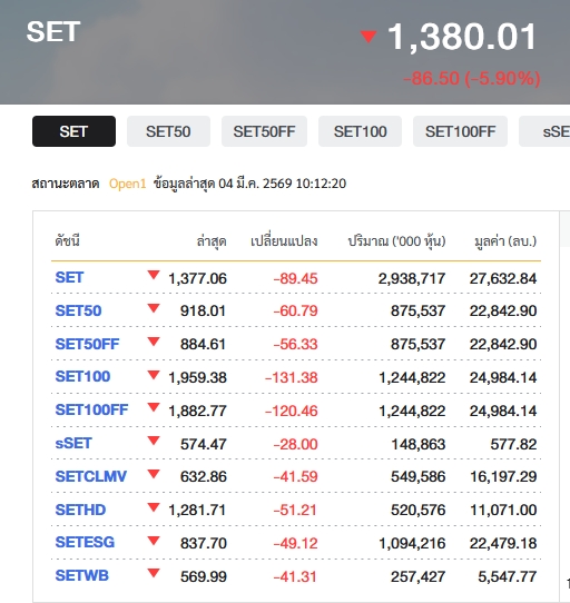 ดัชนีหุ้นไทยเช้านี้ (4 มี.ค.) เปิดตลาดร่วงเกือบ 6% ปมสงครามตะวันออกกลางยืดเยื้อ ดันราคาน้ำมันพุ่ง-กดดันสินทรัพย์เสี่ยงทั่วโลก จับตาตลาดหลักทรัพย์ฯ งัดเซอร์กิจเบรกเกอร์
