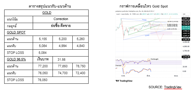 วานนี้ ราคาดีดไม่ผ่าน $5,374 ก่อนหลุด $5,257 ซึ่งเป็น Confirmation การลงต่อ ทำให้ราคาจะเข้าสู่ชุดพักในดีกรีใหญ่กว่าดังคาด อย่างไรก็ดี ราคาลงแรงจนเข้าสู่สภาวะ Oversold และเกิด Bullish Divergence ใน Timeframe ย่อย ทำให้วันนี้คาดหวังการดีดตัวในระยะสั้น สำหรับวันนี้หากยืน $5,084 ได้ยังมองเป็นชุดดีดระยะสั้น โดยมีแนวต้าน $5,155-5,260 แต่หากหลุด $5,084 จะลงเทสแนวรับ