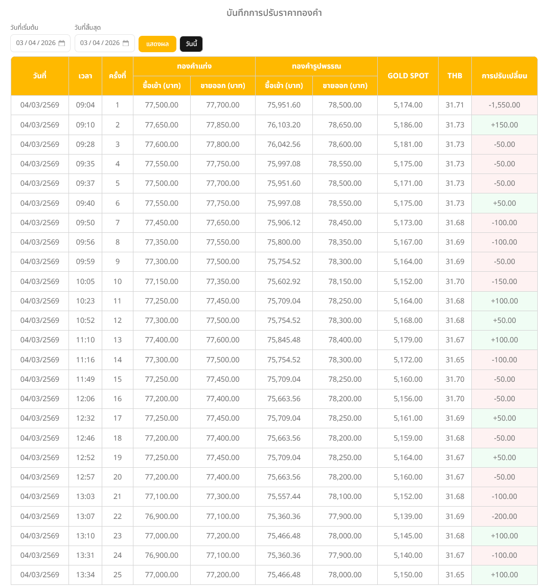 ทั้งนี้ สมาคมค้าทองคำประกาศราคาในประเทศเช้านี้ (4 มี.ค.) เปิดตลาดลดลงทันที 1,550 บาท ในการประกาศครั้งแรก ล่าสุด ประกาศแล้ว 11 ครั้ง ราคาทองแท่งขายออกลงมาอยู่ที่ 77,450 บาท ส่วนทองรูปพรรณขายออกลงมาที่ 78,250 บาท