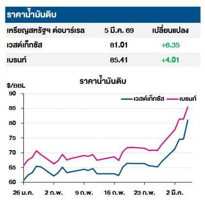 โดยราคาน้ำมันดิบเวสต์เทกซัสซื้อขายเมื่อ 5 มี.ค. 2569 อยู่ที่ 81.01 เหรียญสหรัฐต่อบาร์เรล เพิ่มขึ้น +6.35 เหรียญสหรัฐต่อบาร์เรล และราคาน้ำมันดิบเบรนต์อยู่ที่ 85.41 เหรียญสหรัฐต่อบาร์เรล เพิ่มขึ้น +4.01 เหรียญสหรัฐต่อบาร์เรล