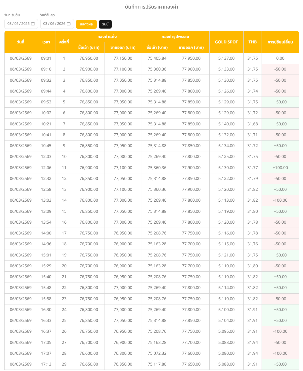อ่านข่าวต้นฉบับ: ราคาทองวันนี้ (6 มี.ค. 69) ปรับลง 300 บาท รูปพรรณบาทละ 77,650 บาท