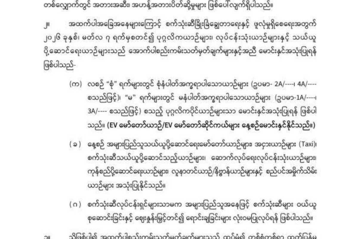 ข้อ ๒. เนื่องจากสถานการณ์ที่กล่าวมาข้างต้น เพื่อเป็นการประหยัดน้ำมันเชื้อเพลิงและสร้างความมั่นคงด้านพลังงาน ตั้งแต่วันที่ 7 มีนาคม พ.ศ. 2026 เป็นต้นไป ยานพาหนะส่วนบุคคล ยานพาหนะที่ใช้ในธุรกิจ และยานพาหนะขนส่ง จะต้องปฏิบัติตามกฎระเบียบและข้อบังคับในการขับขี่และการใช้งานดังนี้:
