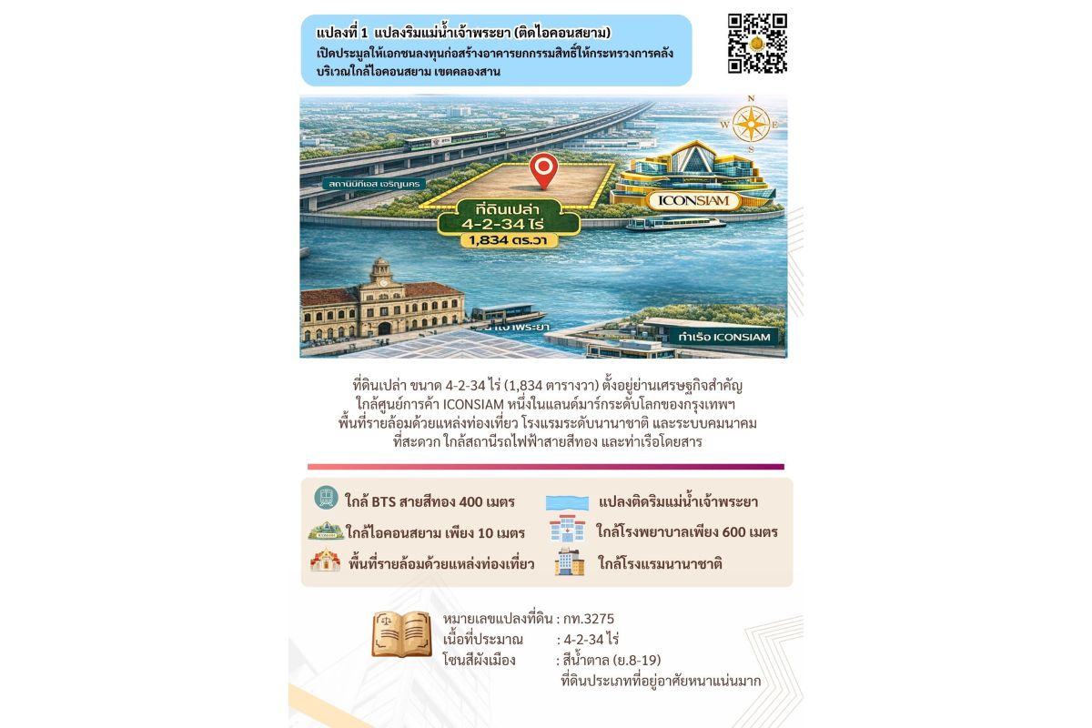 1.แปลงริมแม่น้ำเจ้าพระยา (ติดไอคอนสยาม) เปิดประมูลให้เอกชนลงทุนก่อสร้างอาคารยกกรรมสิทธิ์ ให้กระทรวงการคลัง บริเวณใกล้ไอคอนสยาม เขตคลองสาน (ริมแม่น้ำเจ้าพระยา) ซึ่งเป็นที่ดินเปล่า ขนาด 4-2-34 ไร่ (1,834 ตารางวา) ตั้งอยู่บริเวณย่านเศรษฐกิจสำคัญริมแม่น้ำเจ้าพระยา ใกล้ศูนย์การค้า ICONSIAM หนึ่งในแลนด์มาร์กระดับโลกของกรุงเทพฯ พื้นที่รายล้อมด้วยแหล่งท่องเที่ยว โรงแรมระดับนานาชาติ และระบบคมนาคมที่สะดวก ใกล้สถานีรถไฟฟ้า BTS GOLD LINE และท่าเรือโดยสาร