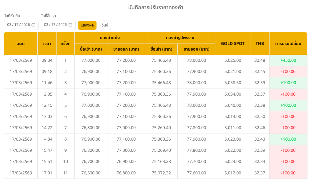 อ่านข่าวต้นฉบับ: ราคาทองวันนี้ (17 มี.ค. 69) ปรับขึ้น 50 บาท ทองรูปพรรณบาทละ 77,600 บาท