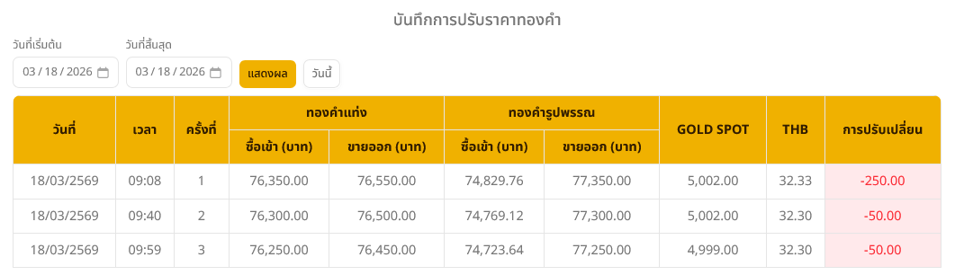 อ่านข่าวต้นฉบับ: ราคาทองวันนี้ (18 มี.ค. 69) ปรับลง 350 บาท ทองรูปพรรณบาทละ 77,250 บาท