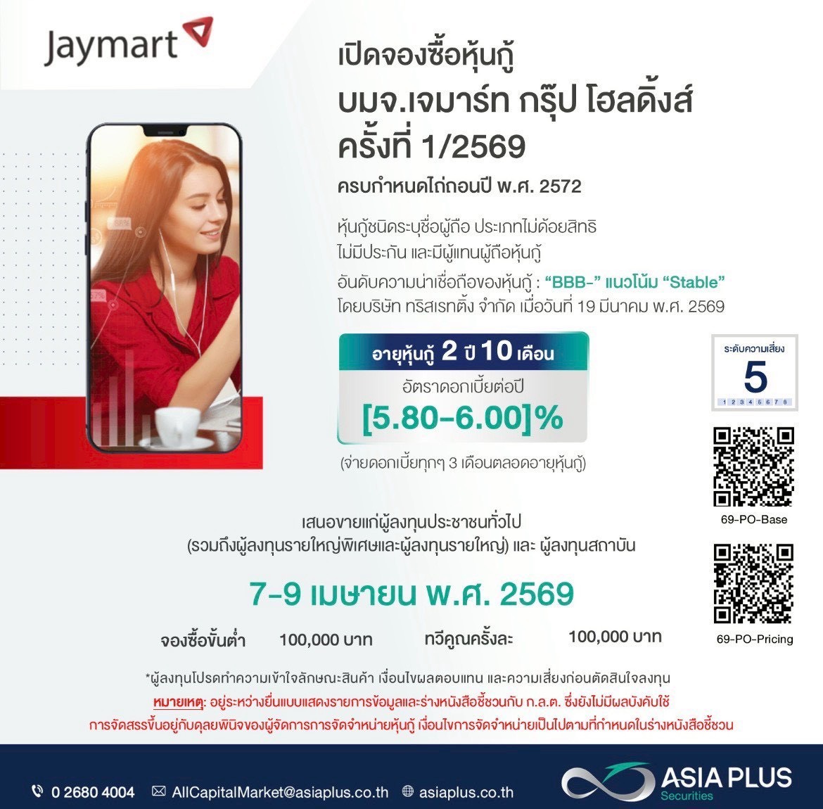 บมจ.เจมาร์ท กรุ๊ป โฮลดิ้งส์ (JMART) เตรียมเสนอขายหุ้น อายุ 2 ปี 10 เดือน ในอัตราดอกเบี้ย [5.80-6.00]% ต่อปี จ่ายดอกเบี้ยทุก 3 เดือน เปิดจองซื้อระหว่างวันที่ 7-9 เมษายน 2569