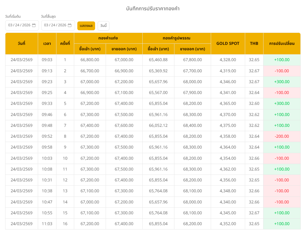 ราคาทองวันนี้ (24 มี.ค. 2569) ปรับขึ้น 500 บาท เมื่อเปรียบเทียบกับราคาปิดวานนี้ โดยราคาทองรูปพรรณขยับมาอยู่ที่บาทละ 68,200 บาท ตามข้อมูลล่าสุด จากเว็บไซต์ของสมาคมค้าทองคำ เมื่อเวลา 11.03 น. ที่ผ่านมา