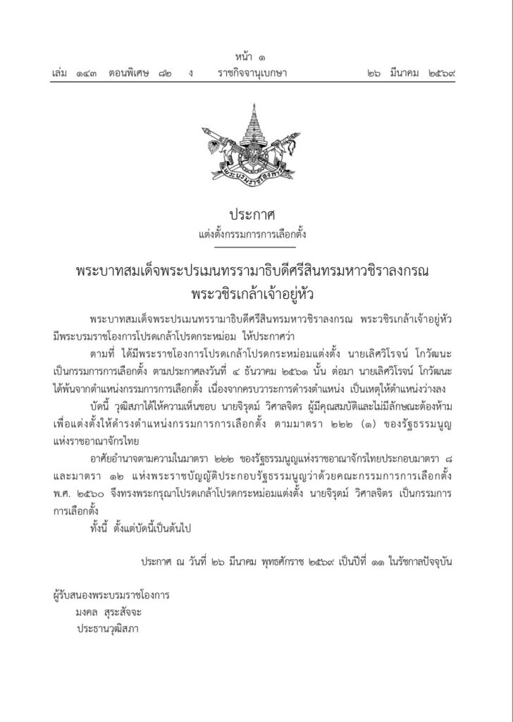 เว็บไซต์ราชกิจจานุเบกษา เผยแพร่ พระบรมราชโองการ ประกาศ แต่งตั้งกรรมการการเลือกตั้ง ความว่าพระบาทสมเด็จพระปรเมนทรรามาธิบดีศรีสินทรมหาวชิราลงกรณ พระวชิรเกล้าเจ้าอยู่หัว มีพระบรมราชโองการโปรดเกล้าโปรดกระหม่อม ให้ประกาศว่า