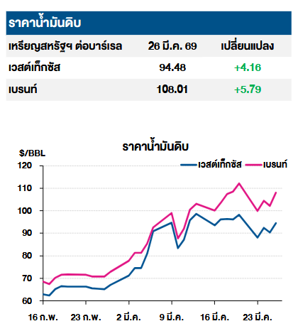 โดยราคาน้ำมันดิบเวสต์เทกซัสซื้อขายเมื่อ 26 มี.ค. 2569 อยู่ที่ 94.48 เหรียญสหรัฐต่อบาร์เรล เพิ่มขึ้น +4.16 เหรียญสหรัฐต่อบาร์เรล และราคาน้ำมันดิบเบรนต์อยู่ที่ 108.01 เหรียญสหรัฐต่อบาร์เรล เพิ่มขึ้น +5.79 เหรียญสหรัฐต่อบาร์เรล