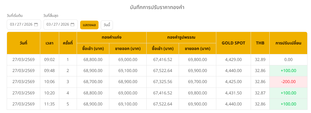 อ่านข่าวต้นฉบับ: ราคาทองวันนี้ (27 มี.ค. 69) ปรับขึ้น 100 บาท ทองรูปพรรณบาทละ 69,900 บาท