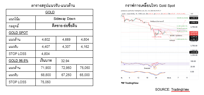 วันศุกร์ ราคาดีดไม่ผ่านแนวต้านแรกบริเวณ $4,602 ทำให้เกิดการพักตัวลงของราคาอีกครั้ง สำหรับวันนี้จับตาบริเวณโซนแนวรับบริเวณ $4,407 หากยืนได้ มองว่าราคายังมีโอกาสดีดตัวทดสอบกรอบแนวต้าน อย่างไรก็ดี หากราคาหลุด $4,407 จะเสียทรงการดีดและราคามีแนวโน้มจะพักตัวหรือปรับตัวลงอีกครั้ง โดยมีแนวรับถัดไปบริเวณ $4,366-4,307 เปิดสถานะขาย หากราคาดีดไม่ผ่าน $4,602-4,669 (ตัดขาดทุนหากราคาดีดผ่าน $4,804) ซื้อคืนสถานะขาย หากไม่หลุด $4,407 หากหลุด $4,407 ชะลอการซื้อคืนไปที่แนวรับ $4,366-4,307