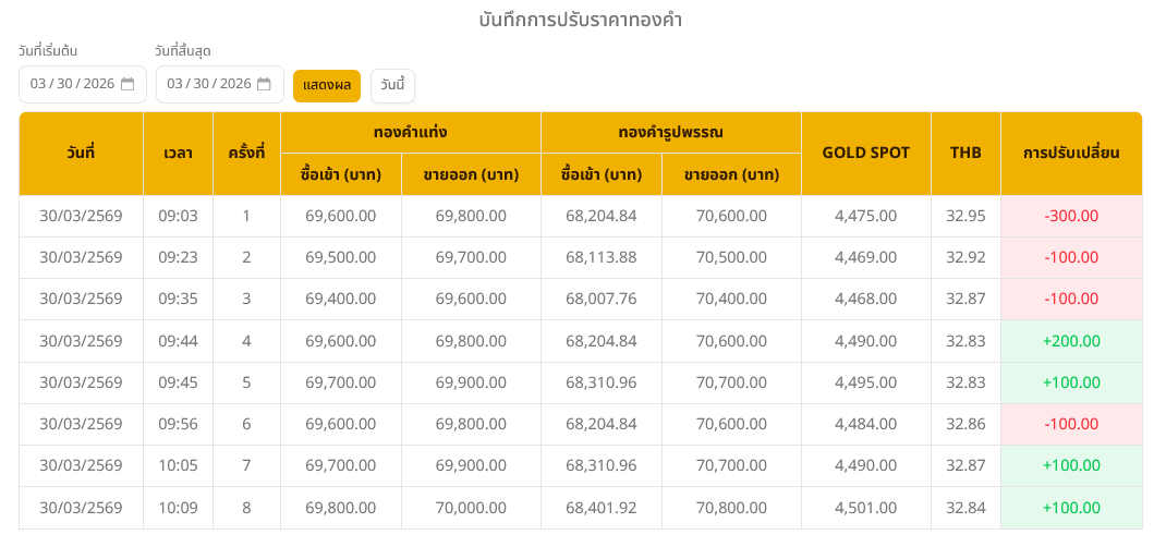 อ่านข่าวต้นฉบับ: ราคาทองวันนี้ (30 มี.ค. 69) ปรับลง 100 บาท ทองรูปพรรณบาทละ 70,800 บาท