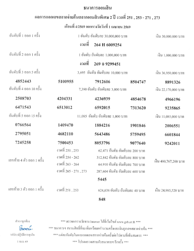 ตรวจผลการออกรางวัลเลขสลากจ่ายคืนสลากออมสินพิเศษ 2 ปี งวดที่ 251, 253-271, 273 เดือนที่ 4/2569 ออกรางวัลวันที่ 1 เมษายน 2569