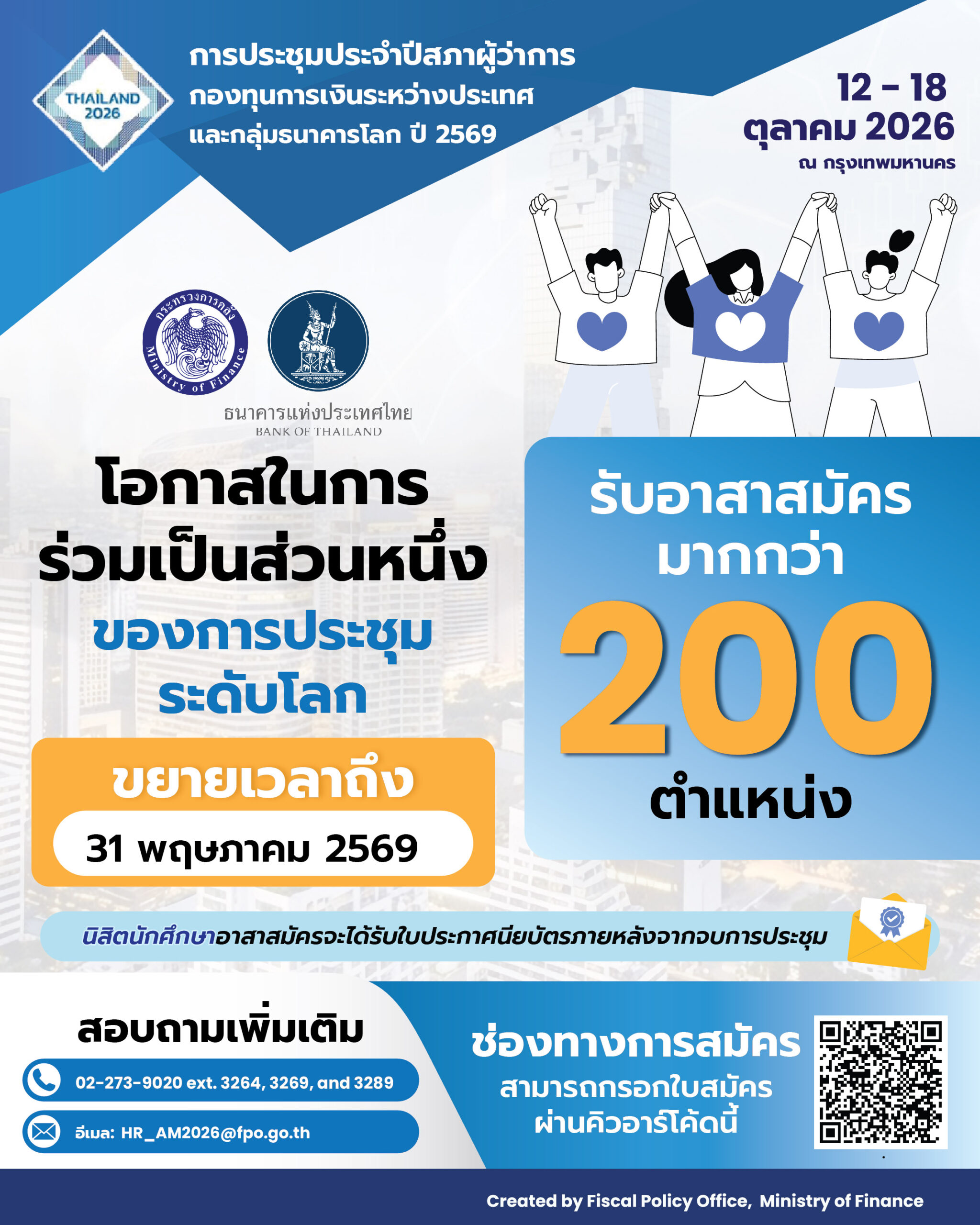 ประตูสู่เวทีโลก! โอกาสครั้งสำคัญ กระทรวงการคลังเปิดรับอาสาสมัครนิสิตนักศึกษาร่วมต้อนรับผู้นำเศรษฐกิจโลก ในฐานะ “ทีมอาสาสมัครประเทศไทย” ในการประชุม 2026 IMF-World Bank Group Annual Meetings 12-18 ต.ค.นี้