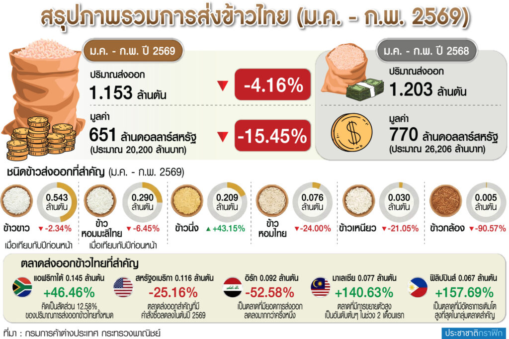 นางอารดา เฟื่องทอง อธิบดีกรมการค้าต่างประเทศระบุว่า สถิติการส่งออกข้าวของไทยในช่วงเดือนมกราคม-กุมภาพันธ์ 2569 ไทยสามารถส่งออกข้าวได้ประมาณ 1.153 ล้านตัน ลดลง 4.16% และมีมูลค่ากว่า 651 ล้านดอลลาร์สหรัฐ หรือประมาณ 20,200 ล้านบาท ลดลง 15.45% เมื่อเทียบกับช่วงเดียวกันของปีก่อน ซึ่งเป็นผลจากปริมาณข้าวในตลาดโลกที่อยู่ในระดับสูง ส่งผลให้การแข่งขันด้านราคามีความรุนแรงมากขึ้น รวมถึงนโยบายจำกัดการนำเข้าของประเทศผู้นำเข้าสำคัญ เช่น อินโดนีเซีย และฟิลิปปินส์