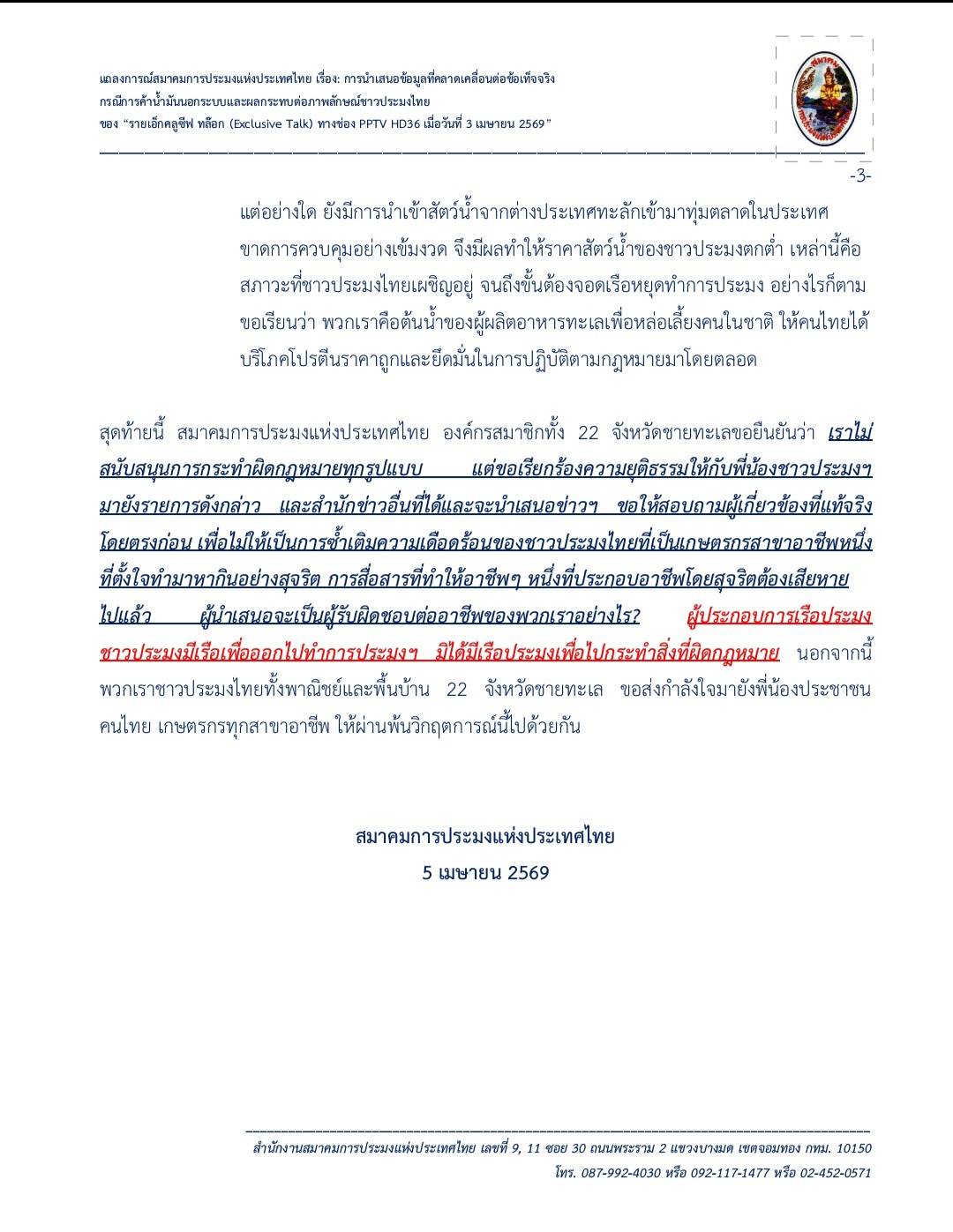 4) วอนสังคมเห็นใจและตรวจสอบข้อมูล: สมาคมฯ ขอวิงวอนให้สื่อมวลชนและบุคคล ต่างๆ นำเสนอข้อมูลบนพื้นฐานของความจริงและรอความชัดเจนจากการตรวจสอบของ ภาครัฐก่อนจะวิพากวิจารณ์ ในเวลานี้ พี่น้องชาวประมงไทยทั้งพาณิชย์และพื้นบ้าน กำลังเผชิญกับวิกฤตและความยากลำบากทางเศรษฐกิจไม่ต่างจากอาชีพอื่นๆ หนำซ้ำในขณะที่น้ำมันเขียวปรับตัวสูงขึ้นในระยะเวลา 1 เดือน (22 กพ.69-22 มี.ค.69) ถึงร้อยละ 120 แต่ราคาสินค้าสัตว์น้ำที่ชาวประมงขายได้ไม่ได้ปรับตัวตามต้นทุนที่สูงขึ้น แต่อย่างใด แถลงการณ์สมาคมการประมงแห่งประเทศไทย เรื่อง: การนำเสนอข้อมูลที่คลาดเคลื่อนต่อข้อเท็จจริง กรณีการค้าน้ำมันนอกระบบและผลกระทบต่อภาพลักษณ์ชาวประมงไทย ของรายการดังกล่าว