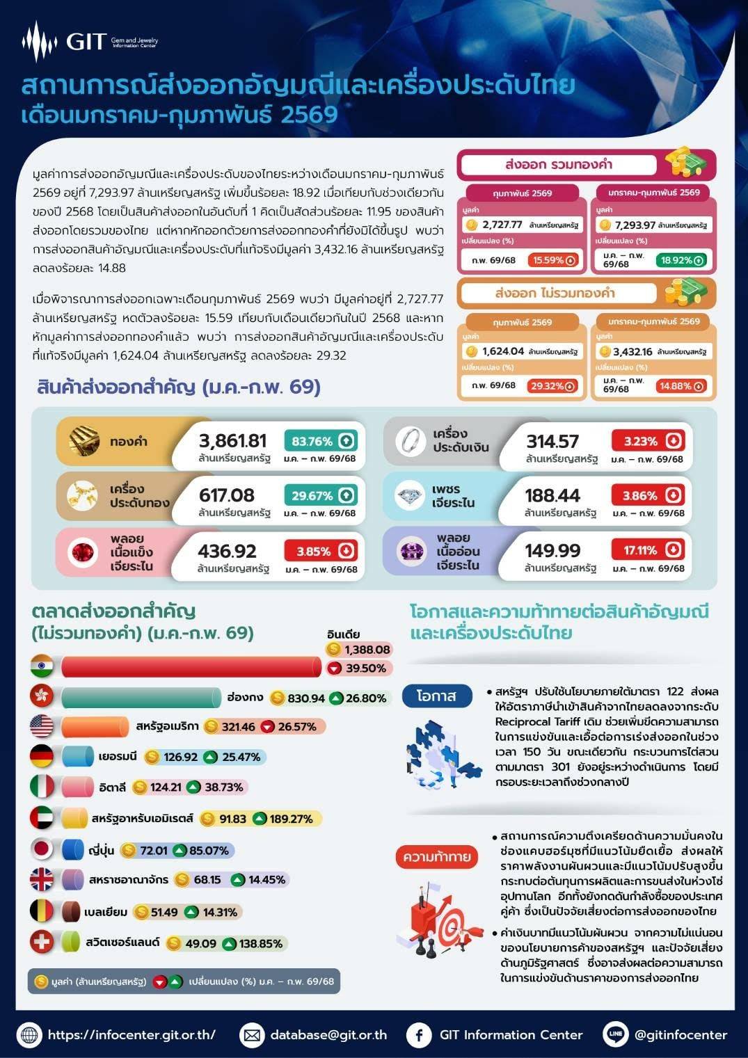 นายสุเมธ ประสงค์พงษ์ชัย ผู้อำนวยการสถาบันวิจัยและพัฒนาอัญมณีและเครื่องประดับแห่งชาติ (องค์การมหาชน) หรือ GIT เปิดเผยว่า การส่งออกอัญมณีและเครื่องประดับ ไม่รวมทองคำ เดือน ก.พ.2569 มีมูลค่า 1,624.04 ล้านดอลลาร์สหรัฐ ลดลง 29.32% กลับมาลดลงอีกครั้ง หลังจากเพิ่มบวกเมื่อเดือน ม.ค.2569 ที่ผ่านมา หากรวมทองคำ มีมูลค่า 2,727.77 ล้านดอลลาร์สหรัฐ ลดลง 15.59% รวม 2 เดือนปี 2569 (ม.ค.-ก.พ.) ส่งออกไม่รวมทองคำ มูลค่า 3,432.16 ล้านดอลลาร์สหรัฐ ลด 14.88% รวมทองคำมูลค่า 7,293.97 ล้านดอลลาร์สหรัฐ เพิ่ม 18.92%