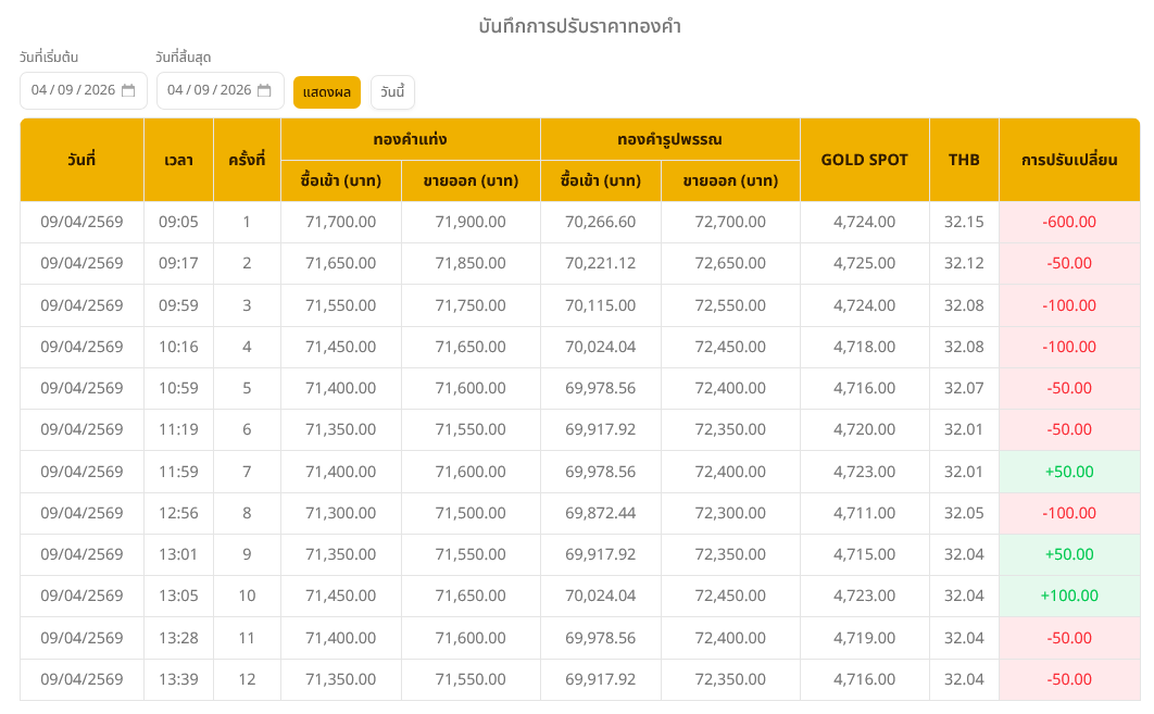 อ่านข่าวต้นฉบับ: ราคาทองวันนี้ (9 เม.ย. 69) ปรับลง 900 บาท ทองรูปพรรณบาทละ 72,400 บาท