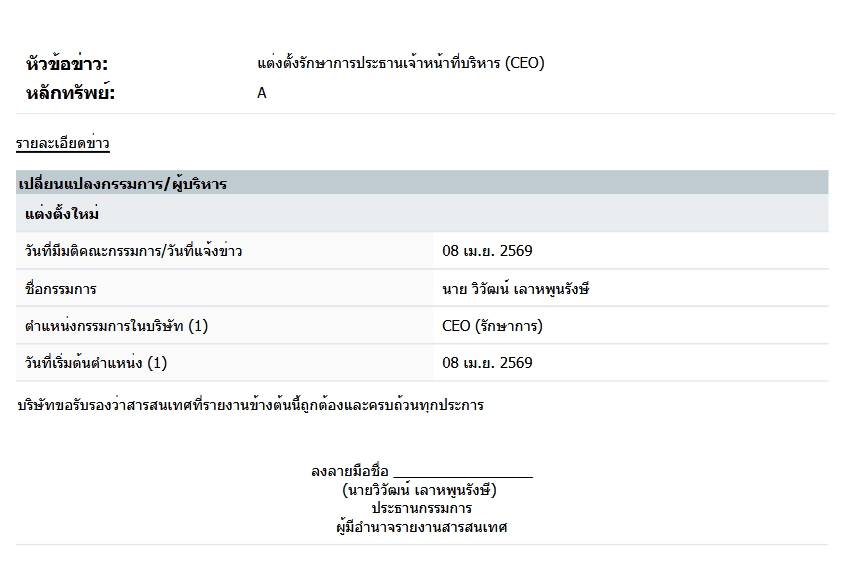 บริษัท อารียา พรอพเพอร์ตี้ จำกัด (มหาชน) หรือ A รายงานตลาดหลักทรัพย์ฯ ว่า บริษัทได้แต่งตั้งนายวิวัฒน์ เลาหพูนรังษี ดำรงรักษาการประธานเจ้าหน้าที่บริหาร (CEO) มีผลตั้งแต่วันที่ 8 เม.ย. 2569