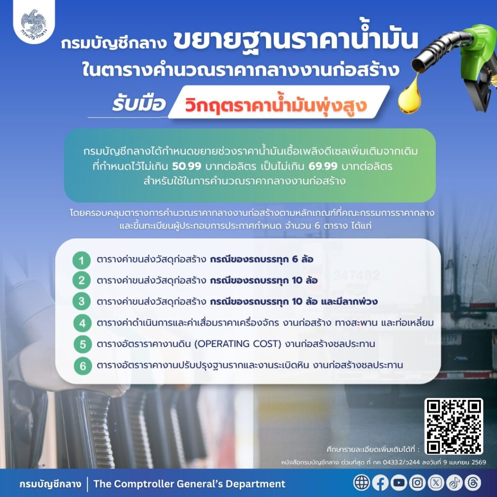 กรมบัญชีกลางขยายฐานราคาน้ำมันดีเซล ในตารางคำนวณราคากลางงานก่อสร้าง จากเดิมไม่เกิน 50.99 บาทต่อลิตร เป็นไม่เกิน 69.99 บาทต่อลิตร รับมือวิกฤตราคาน้ำมันพุ่งสูง