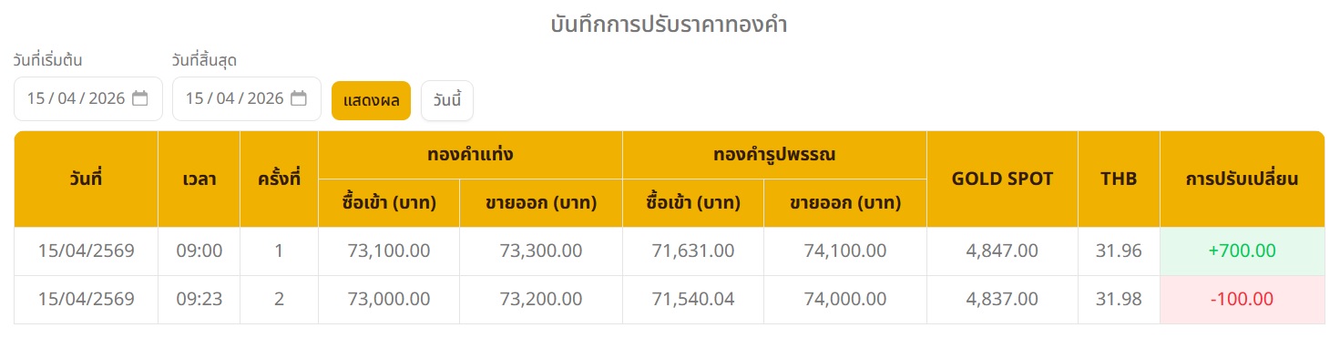 อ่านข่าวต้นฉบับ: ราคาทองวันนี้ (15 เม.ย. 69) ปรับขึ้น 600 บาท ทองรูปพรรณบาทละ 74,000 บาท