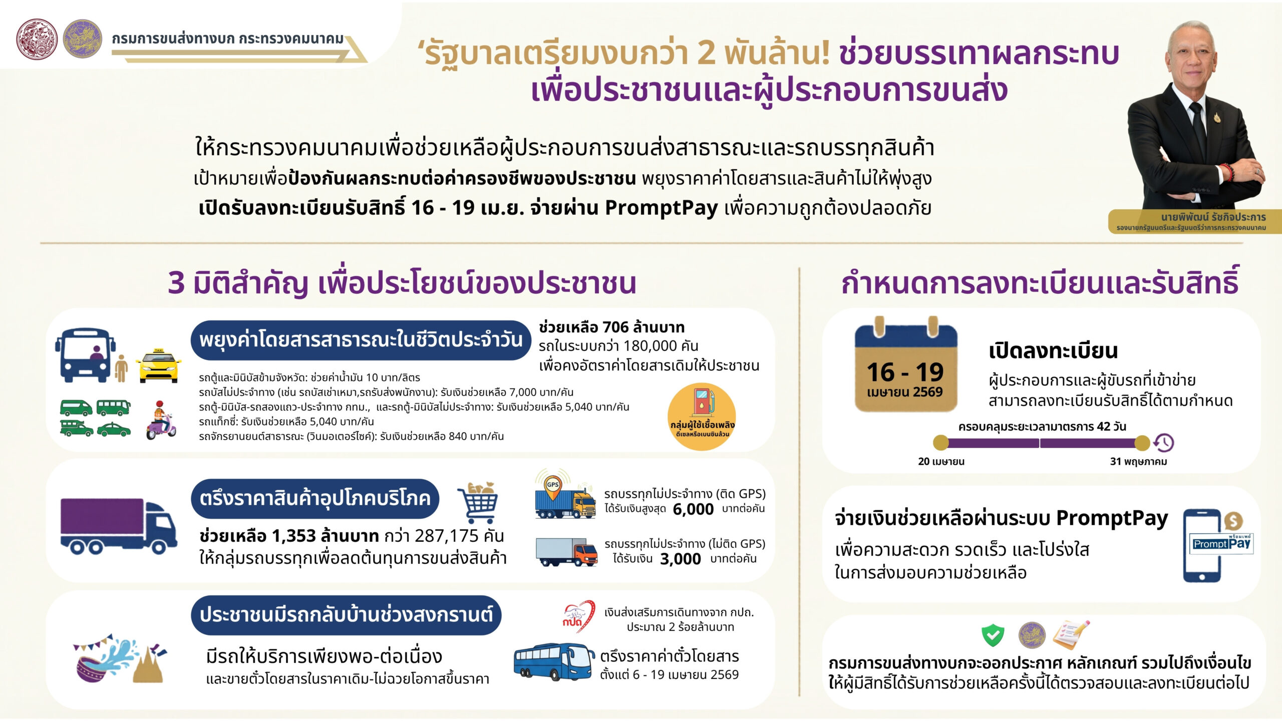 สำหรับกลุ่มผู้ประกอบการขนส่งและผู้ขับรถที่เข้าข่ายได้รับการช่วยเหลือ กรมการขนส่งทางบกจะเปิดให้ ลงทะเบียนรับสิทธิ์ระหว่างวันที่ 16-19 เมษายน 2569 โดยจะจ่ายเงินช่วยเหลือผ่านระบบ PromptPay เพื่อช่วยเหลือผู้ประกอบการขนส่งในการเดินรถตลอดระยะเวลา 42 วัน (20 เม.ย.-31 พ.ค. 2569) โดยกรมการขนส่งทางบกจะออกประกาศ หลักเกณฑ์ รวมไปถึงเงื่อนไขให้ผู้มีสิทธิ์ได้รับการช่วยเหลือครั้งนี้ได้ตรวจสอบและลงทะเบียนต่อไป