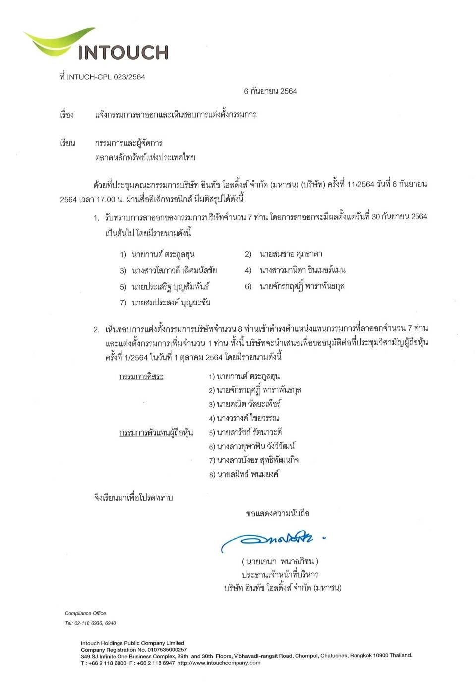 วันที่ 6 กันยายน 2564 นายเอนก พนาอภิชน ประธานเจ้าหน้าที่บริหาร บริษัท อินทัช โฮลดิ้งส์ จำกัด (มหาชน) หรือ INTUCH เปิดเผยว่า ที่ประชุมคณะกรรมการบริษัทฯ เมื่อวันที่ 6 ก.ย.2564 มีมติเห็นชอบการแต่งตั้งกรรมการบริษัทจำนวน 8 ท่าน เข้าดำรงตำแหน่งแทนกรรมการที่ลาออกจำนวน 7 ท่าน และแต่งตั้งกรรมการเพิ่ม 1 ท่าน โดยจะนำเสนอเพื่อขออนุมัติต่อที่ประชุมวิสามัญผู้ถือหุ้น ครั้งที่ 1/2564 ในวันที่ 1 ต.ค.64 โดยมีรายนามดังนี้