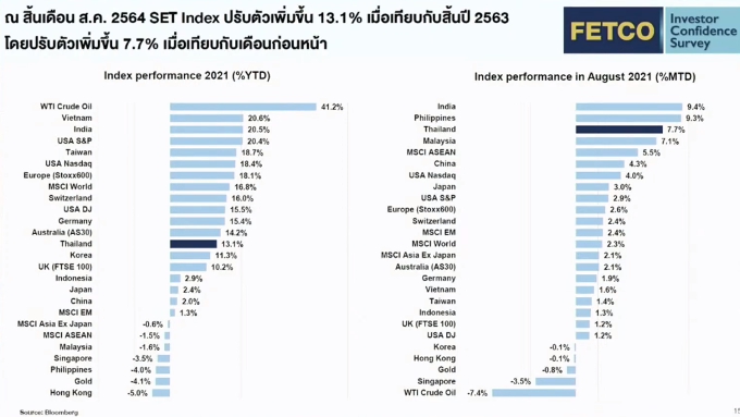 โดยตั้งแต่ต้นปีถึงปัจจุบัน(ณ สิ้นเดือน ส.ค.64) ผลตอบแทนดัชนีตลาดหุ้นไทยปรับตัวบวก 13.1% เฉพาะในเดือน ส.ค.64 ปรับตัวบวกถึง 7.7% เมื่อเทียบจากเดือนก่อนหน้า ยืนเป็นอันดับ 3 เทียบดัชนีตลาดหุ้นในเอเชียและยุโรปบางประเทศ เป็นรองแค่ตลาดหุ้นอินเดียและฟิลิปปินส์ สะท้อนว่านักลงทุนเริ่มมีทิศทาง Bullish ต่อตลาดหุ้นอาเซียนมากขึ้น จากที่เป็นภูมิภาคที่ได้รับผลกระทบโควิดสายพันธุ์เดลต้ามากที่สุด