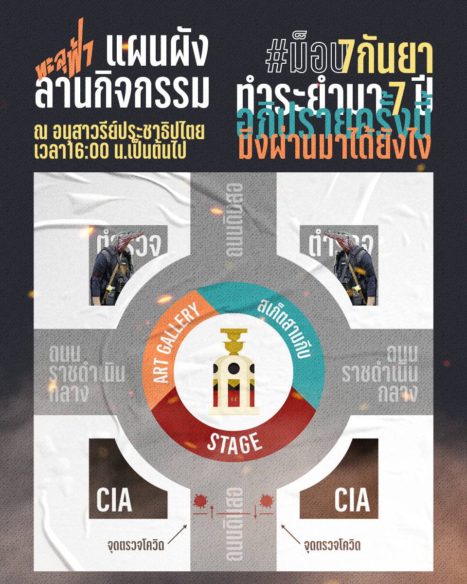 สำหรับม็อบ 7 กันยา บริเวณอนุสาวรีย์ประชาธิปไตย จัดขึ้นโดยกลุ่มทะลุฟ้า โดยเริ่มกิจกรรมตั้งแต่เวลา 16.00 น. โดยจะมีกิจกรรมต่าง ๆ มากมาย ได้แก่ สกรีนเสื้อ, art gallery, สเก็ตสามกีบ, ลาน CIA กลุ่มผู้ประกอบการรายย่อย, จุดคัดกรองโควิด-19 และกิจกรรมขีดเขียนหน้าของนายกรัฐมนตรี