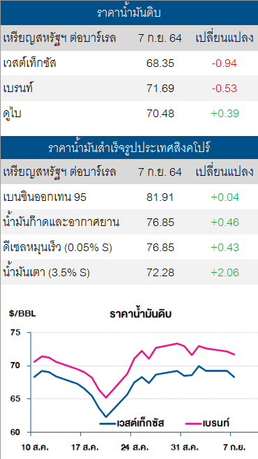 ปัจจัยลบ ราคาน้ำมันดิบเวสต์เท็กซัสและเบรนท์ปรับตัวลดลง หลังตลาดมองว่าการประกาศปรับลดราคาขายน้ำมันดิบอย่างเป็นทางการ (OSPs) สำหรับน้ำมันดิบทุกเกรดแก่ผู้ซื้อในทวีปเอเชียของซาอุดีอาระเบีย เป็นสัญญาณว่าความต้องการใช้น้ำมันดิบในภูมิภาคเอเชียจะยังคงซบเซา แม้ว่าตัวเลขการส่งออกสินค้าในเดือน ส.ค. ของจีน จะปรับตัวเพิ่มขึ้นมากกว่าที่นักวิเคราะห์คาดการณ์ไว้ สะท้อนถึงการฟื้นตัวของเศรษฐกิจโลก