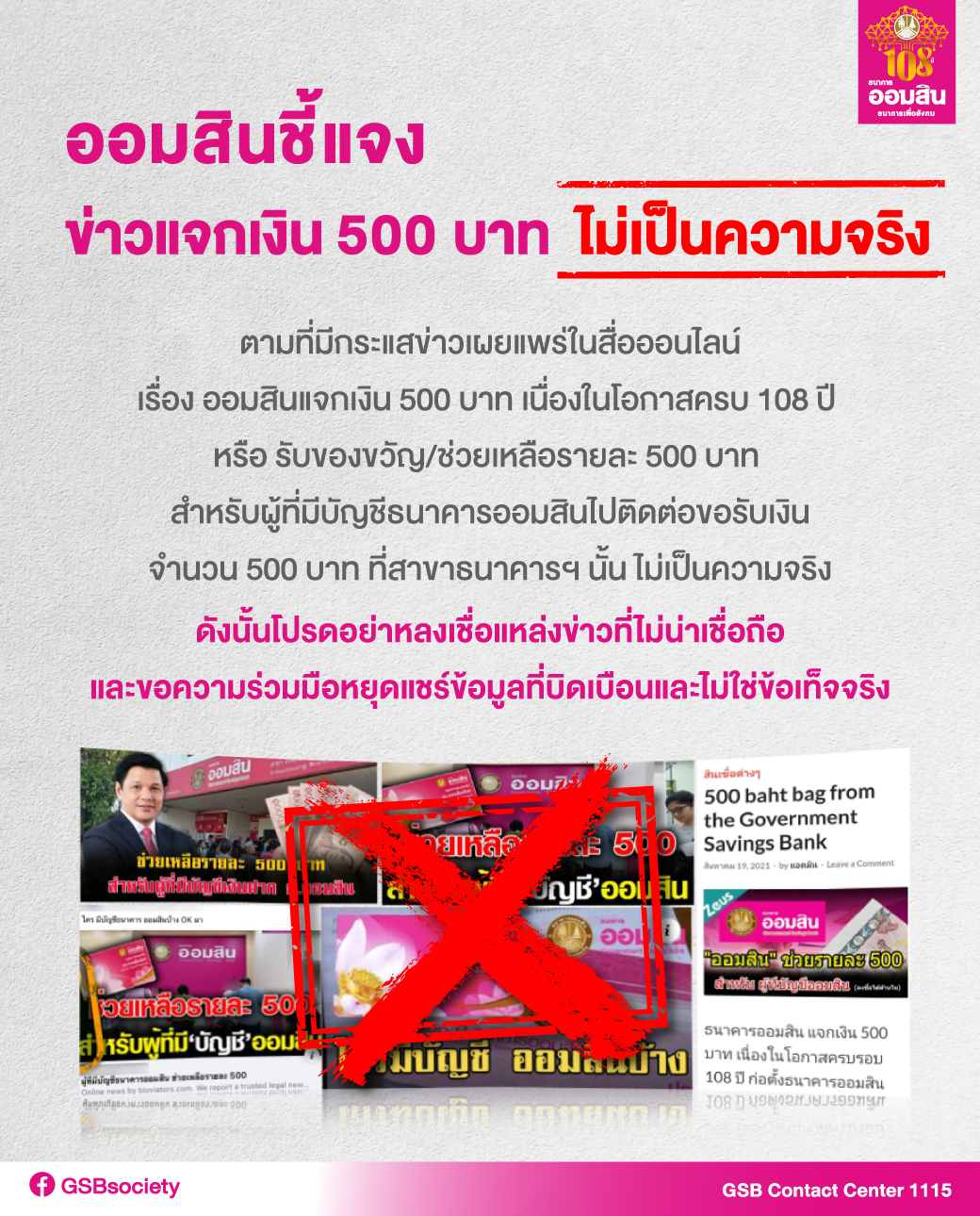 อ่านข่าวต้นฉบับ: ออมสิน แจงข่าวแบงก์แจกเงิน 500 บาท ไม่เป็นความจริง