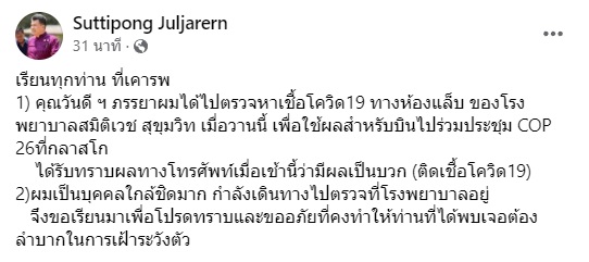 “สุทธิพงษ์ จุลเจริญ” ปลัดกระทรวงมหาดไทย แจ้งข่าว ภรรยาติดโควิด หลังเตรียมบินร่วมประชุม COP 26 เจ้าตัวรีบเดินทางไปตรวจหาเชื้อ