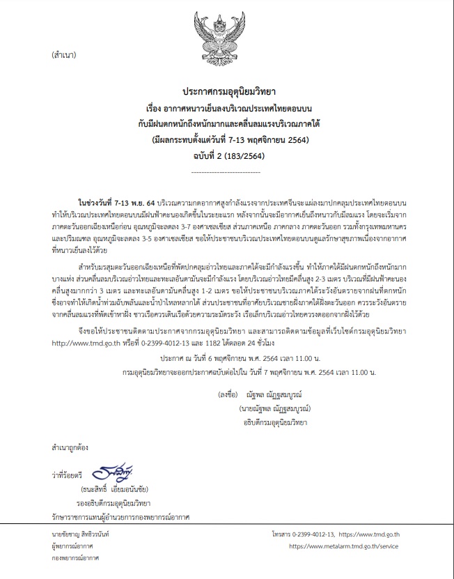 ประกาศ ณ วันที่ 6 พฤศจิกายน พ.ศ. 2564 เวลา 11.00 น. กรมอุตุนิยมวิทยาจะออกประกาศฉบับต่อไปใน วันที่ 7 พฤศจิกายน พ.ศ. 2564 เวลา 11.00 น.