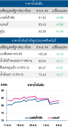 ปัจจัยบวก ความต้องการใช้น้ำมันได้รับแรงหนุน หลังสหรัฐเปิดพรมแดนระหว่างประเทศรับชาวต่างชาติที่ได้รับการฉีดวัคซีนครบโดสแล้วเป็นวันแรก เมื่อวันที่ 8 พ.ย. 2564 ส่งผลให้กิจกรรมการเดินทางในประเทศปรับตัวสูงขึ้น หลังจากที่ก่อนหน้านี้สหรัฐมีการจำกัดการเดินทางระหว่างประเทศมามากกว่า 18 เดือน