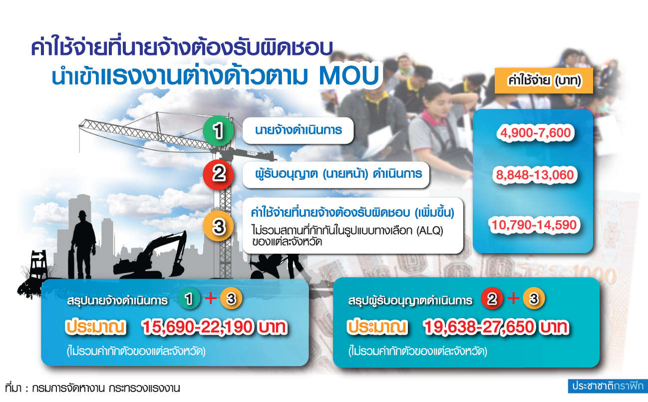 กรมการจัดหางาน กระทรวงแรงงาน ประมาณการค่าใช้จ่ายภายในประเทศไทยที่นายจ้างต้องรับผิดชอบในการนำเข้าแรงงานต่างด้าวตาม MOU แบ่งเป็นค่าใช้จ่ายนำเข้าแรงงานต่างด้าวตาม MOU หากนายจ้างดำเนินการเอง ประมาณ 4,900-7,600 บาท