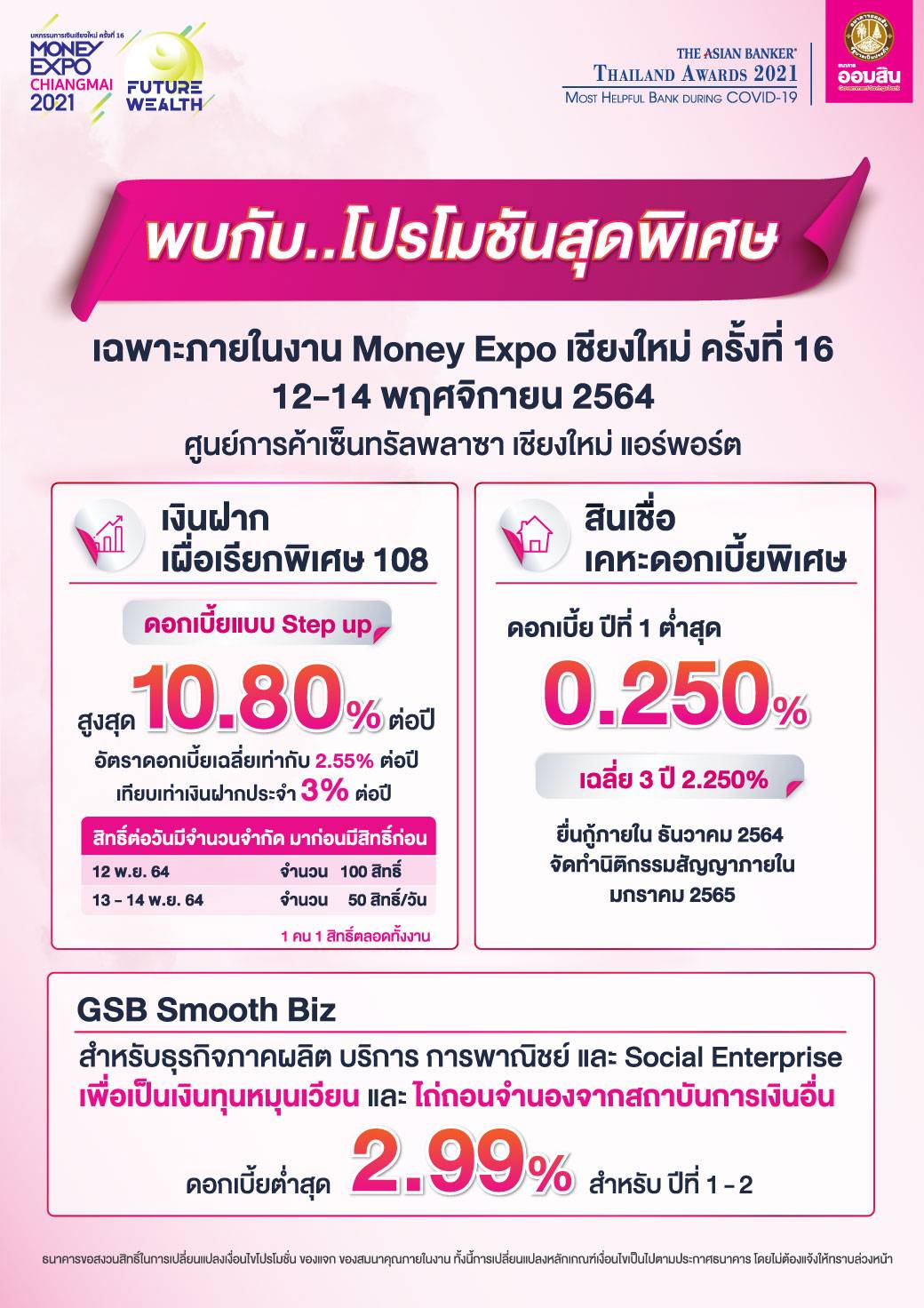 สำหรับ Money Expo เชียงใหม่ปีนี้ โปรโมชั่นไฮไลต์ในส่วนของสินเชื่อประกอบด้วย สินเชื่อเคหะดอกเบี้ยพิเศษ ปีแรก 0.250% ต่อปี เฉลี่ย 3 ปี เท่ากับ 2.250% ต่อปี สินเชื่อ GSB Smooth BIZ เพื่อเป็นเงินทุนหมุนเวียนหรือลงทุนในธุรกิจอัตราดอกเบี้ยต่ำสุด 2 ปีแรก 2.99% ต่อปี ระยะเวลาผ่อนชำระนานสูงสุด 10 ปี วงเงินกู้สูงสุดถึง 20 ล้านบาท พร้อมด้วยสินเชื่อเพื่อเป็นทุนประกอบอาชีพ