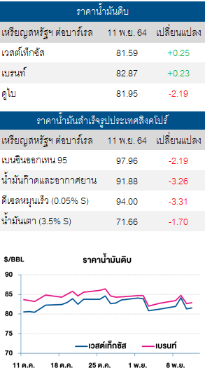 ปัจจัยลบ/บวก การซื้อขายในตลาดน้ำมันเมื่อคืนนี้ยังคงได้รับแรงกดดันจากความกังวลเกี่ยวกับเงินเฟ้อในสหรัฐฯ หลังดัชนีราคาผู้บริโภค (CPI) พุ่งขึ้น 6.2% ในเดือน ต.ค. เมื่อเทียบรายปี ซึ่งเป็นระดับสูงสุดนับตั้งแต่เดือน ธ.ค. 2533